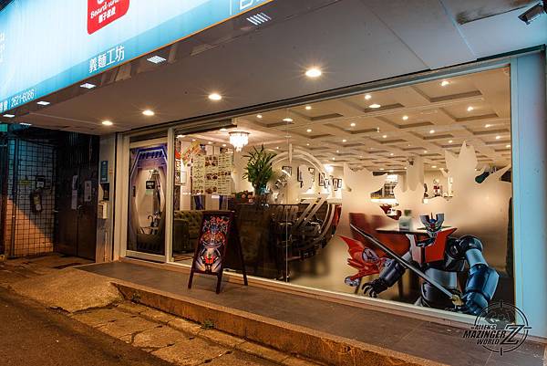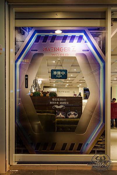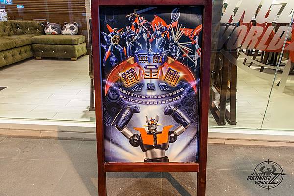 ▼偌大的櫥窗玻璃,以霧面的魔神三兄弟與LOGO圖案為背景,配上彩色的無敵鐵金剛