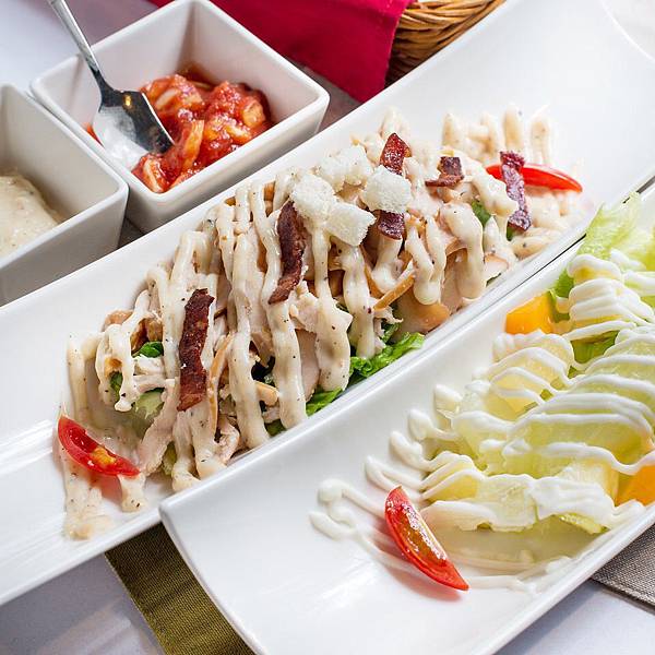 ▼凱撒雞肉沙拉(左)、水果優格沙拉